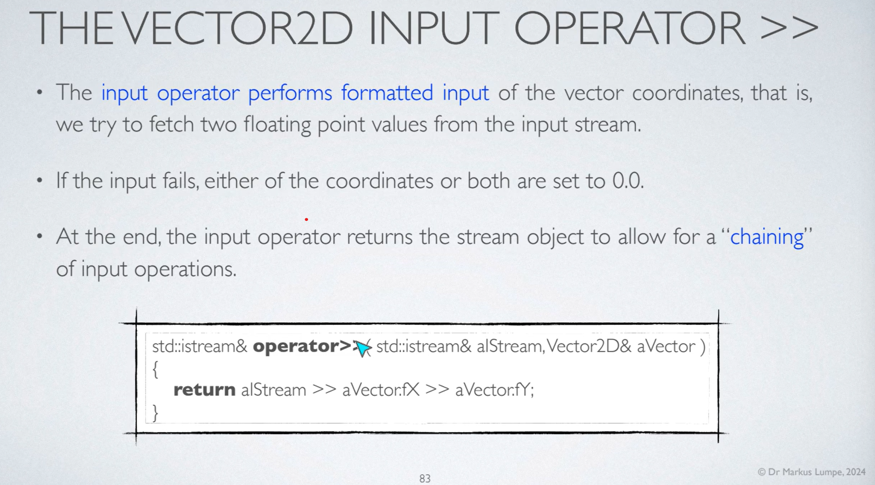 이 연산자는 벡터 좌표의 형식화된 입력을 수행합니다. 즉, 입력 스트림에서 두 개의 부동 소수점 값을 가져오려고 시도합니다. 만약 입력이 실패하면, 좌표 값은 0.0으로 설정됩니다. 마지막으로, 입력 연산자는 스트림 객체를 반환하여 입력 작업을 연속적으로 수행할 수 있도록 합니다.