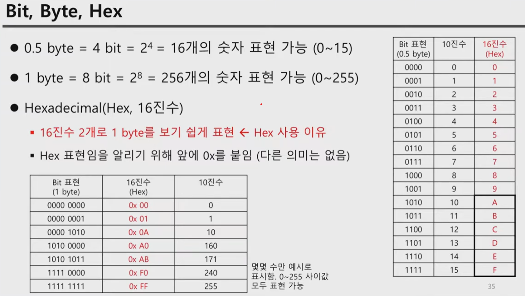 - 실제로는 0,1 binary로 저장되지만, 불편하니 Hex로 표현함