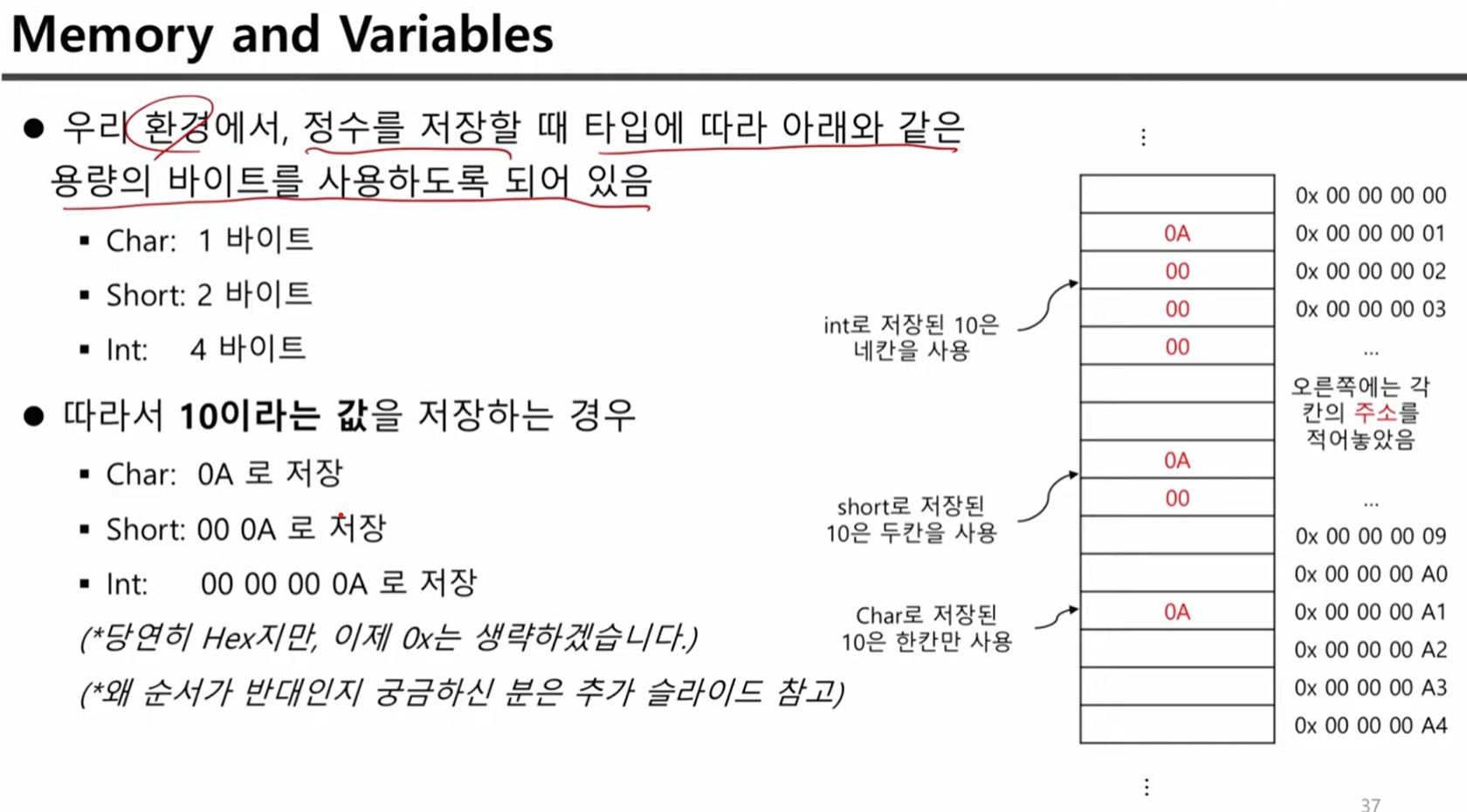 - 변수를 만들면, 메모리에 변수를 위한 공간(바이트)이 확보됨
