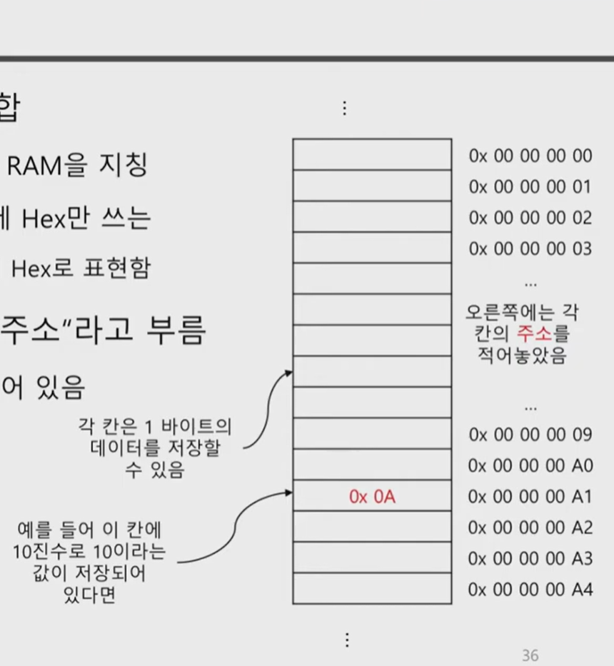 - 각 바이트에는 번호가 붙어있고, 이를"주소"라고 부름